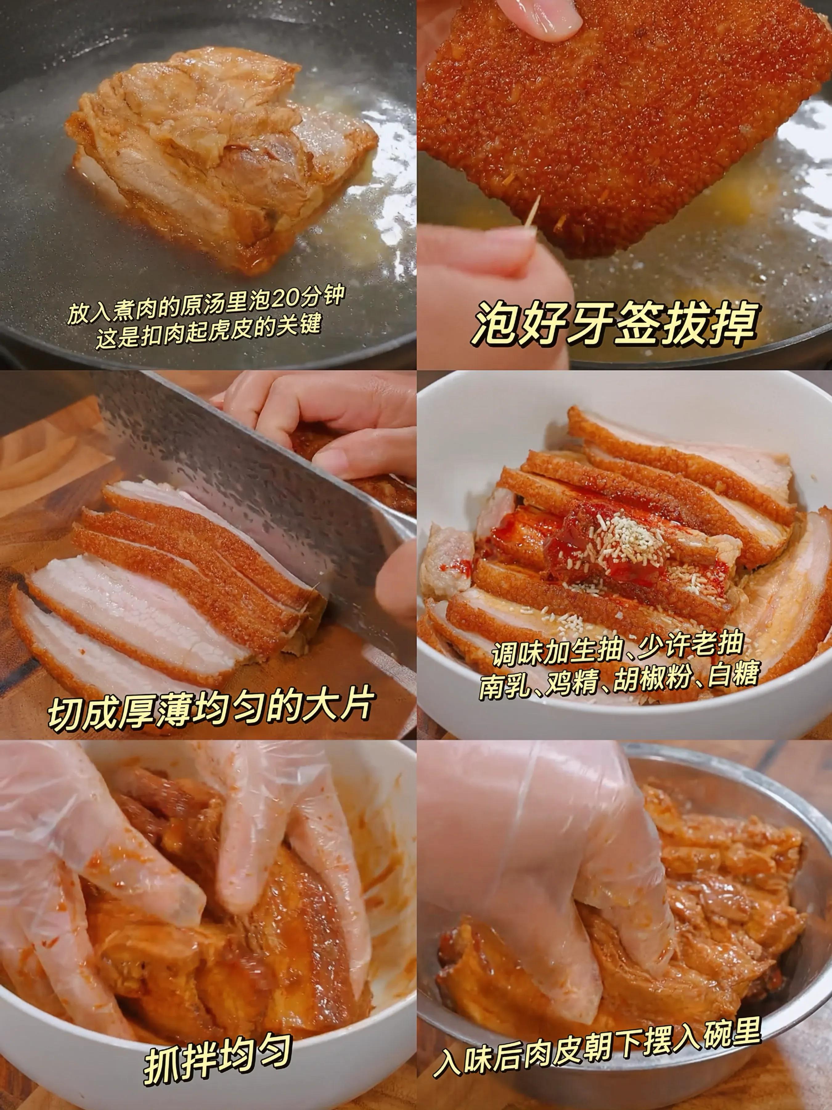 3️⃣:炸好捞出放入煮肉的汤里泡20分钟,这是扣肉起虎皮的关键,泡好把牙签取下来,放在案板上切成厚厚的大薄片;