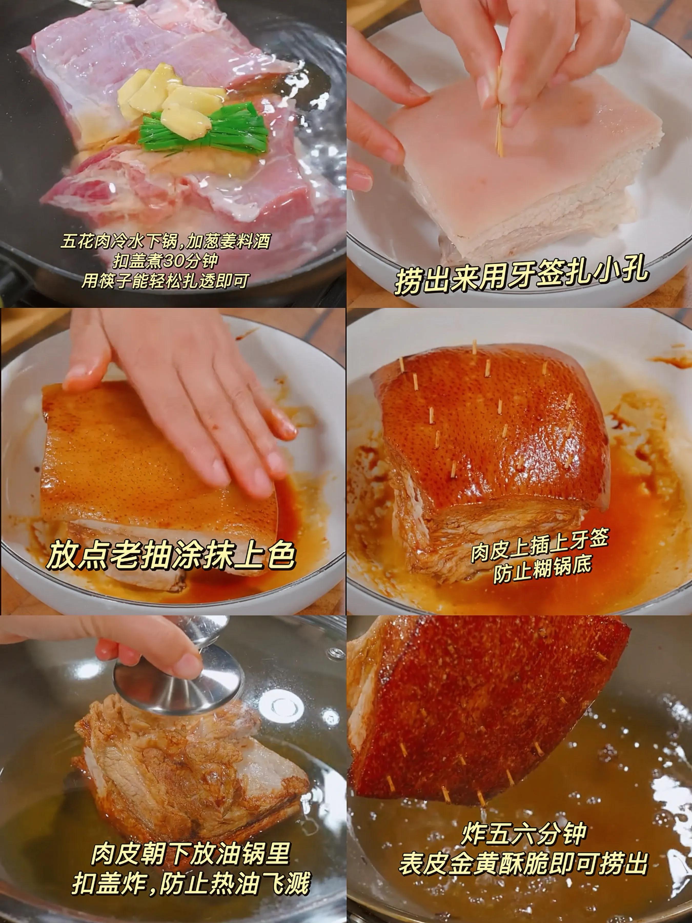 2️⃣:肉皮上在插满牙签(这样能防止炸的时候糊锅底),锅里倒凉油,肉皮朝下放,扣盖开火炸,这样能防止油花乱嘣,大概炸个五六分钟,表皮金黄酥脆就可以捞出来了;